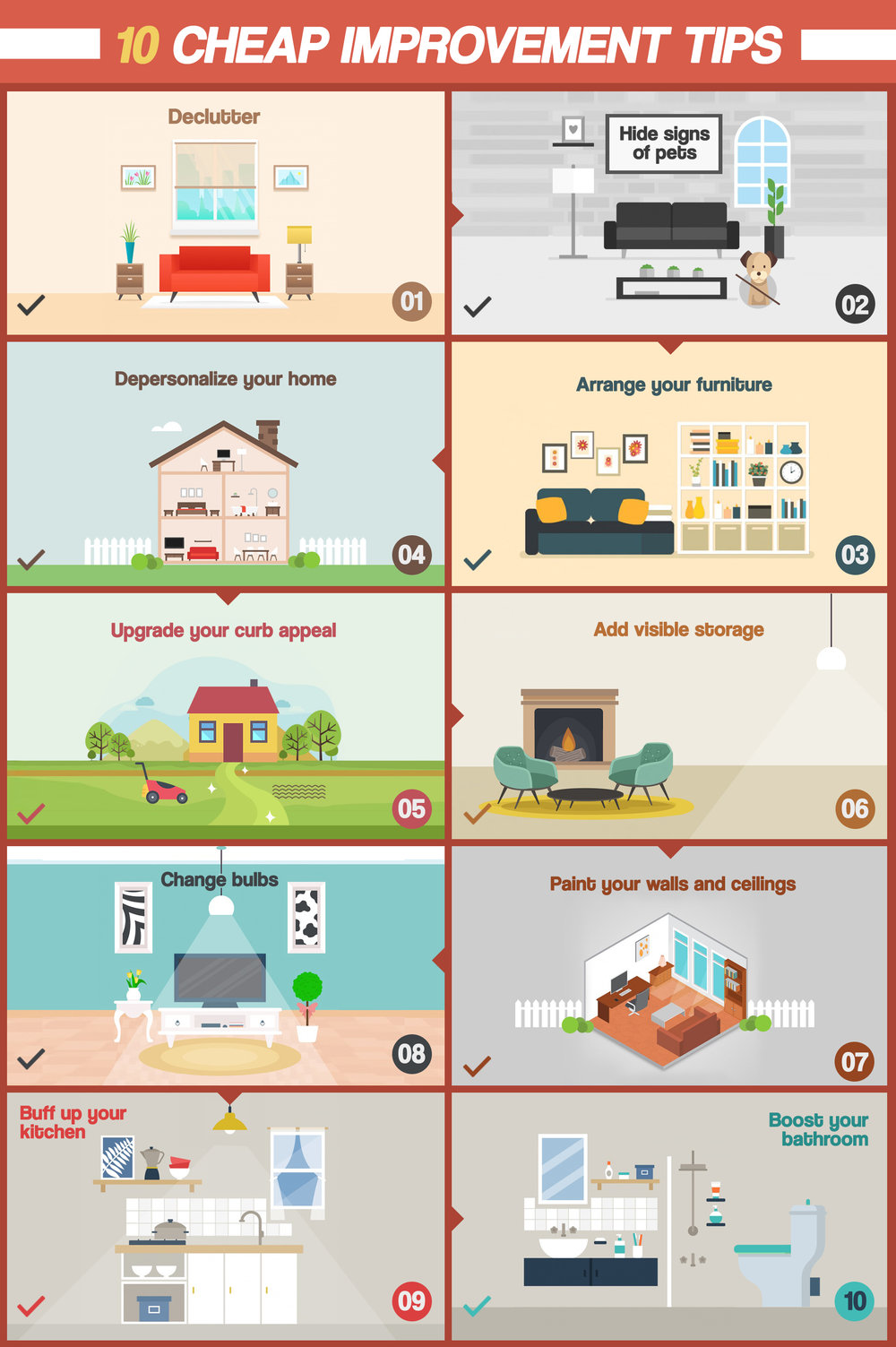 You might be dreading the idea of improving your home because it might cause you a fortune. Don’t fret! This list will enlighten you that simple and easy measures which you can do yourself will make a big (and positive!) difference in your home. You can ask your agent how to stage your home best, but it won’t hurt to get a headstart on making your home as presentable as it may be – without having to spend thousands of dollars.